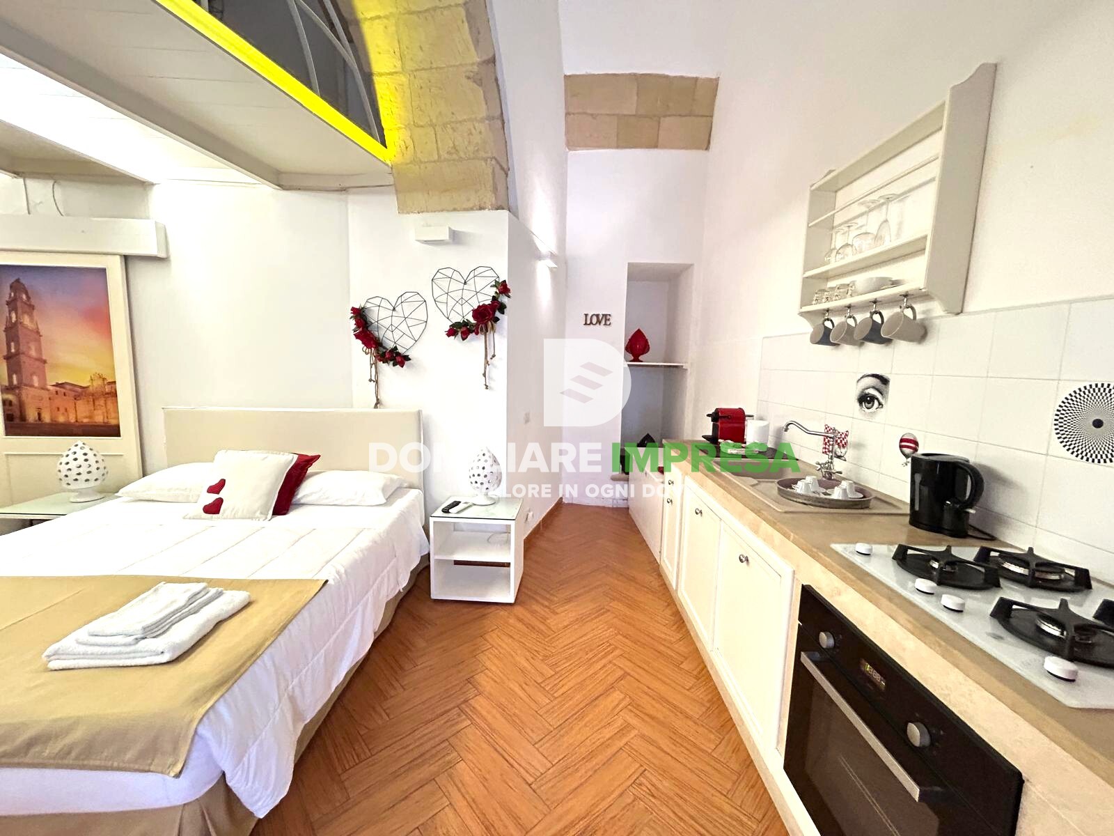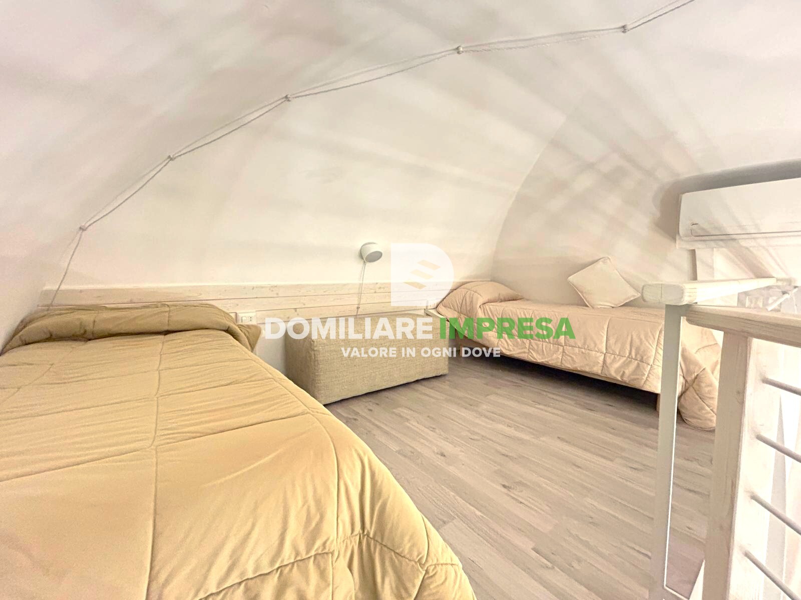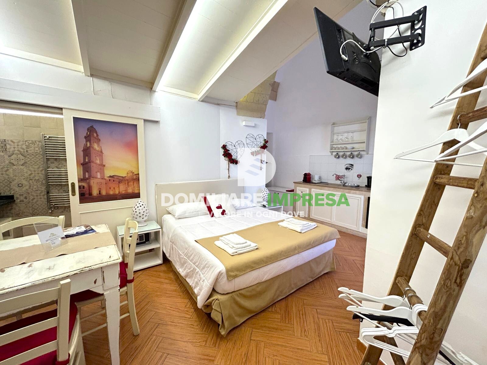 -Suite 2: soluzione di charme con open space (ingresso/living e angolo cottura con letto matrimoniale), soppalco con due lettini e bagno.