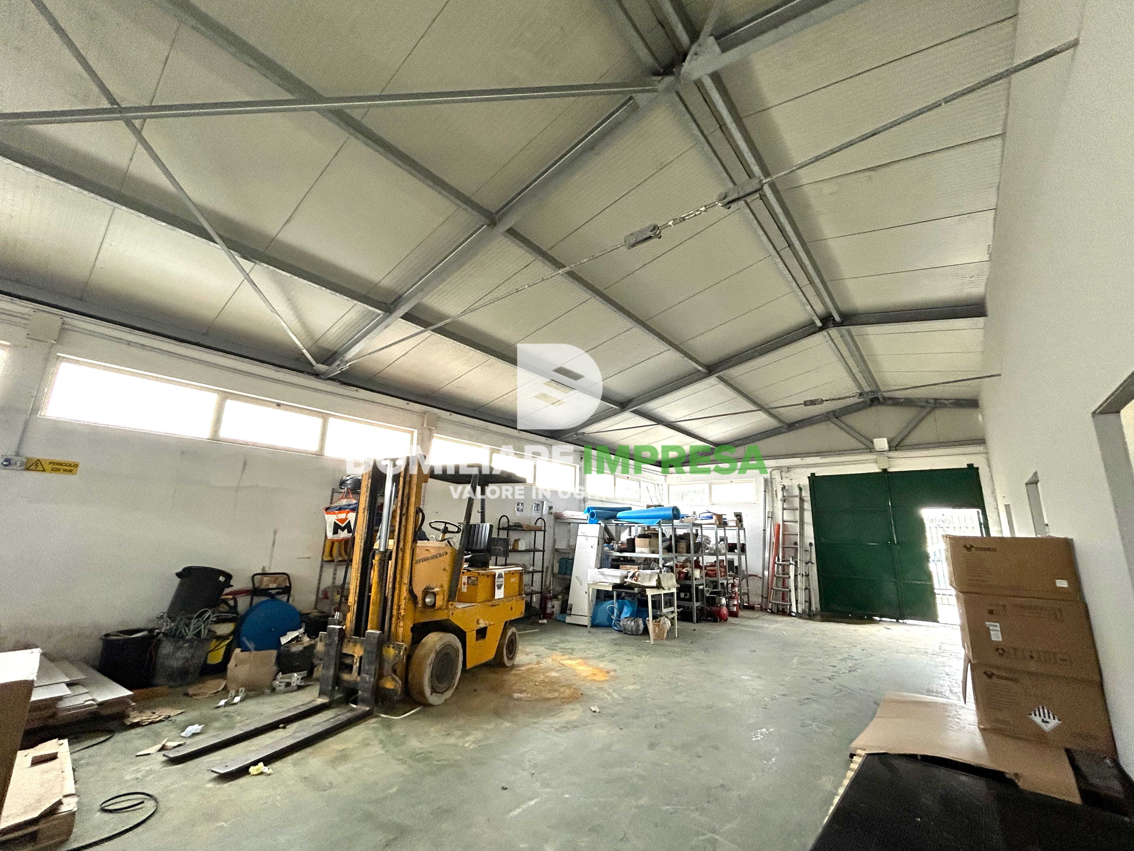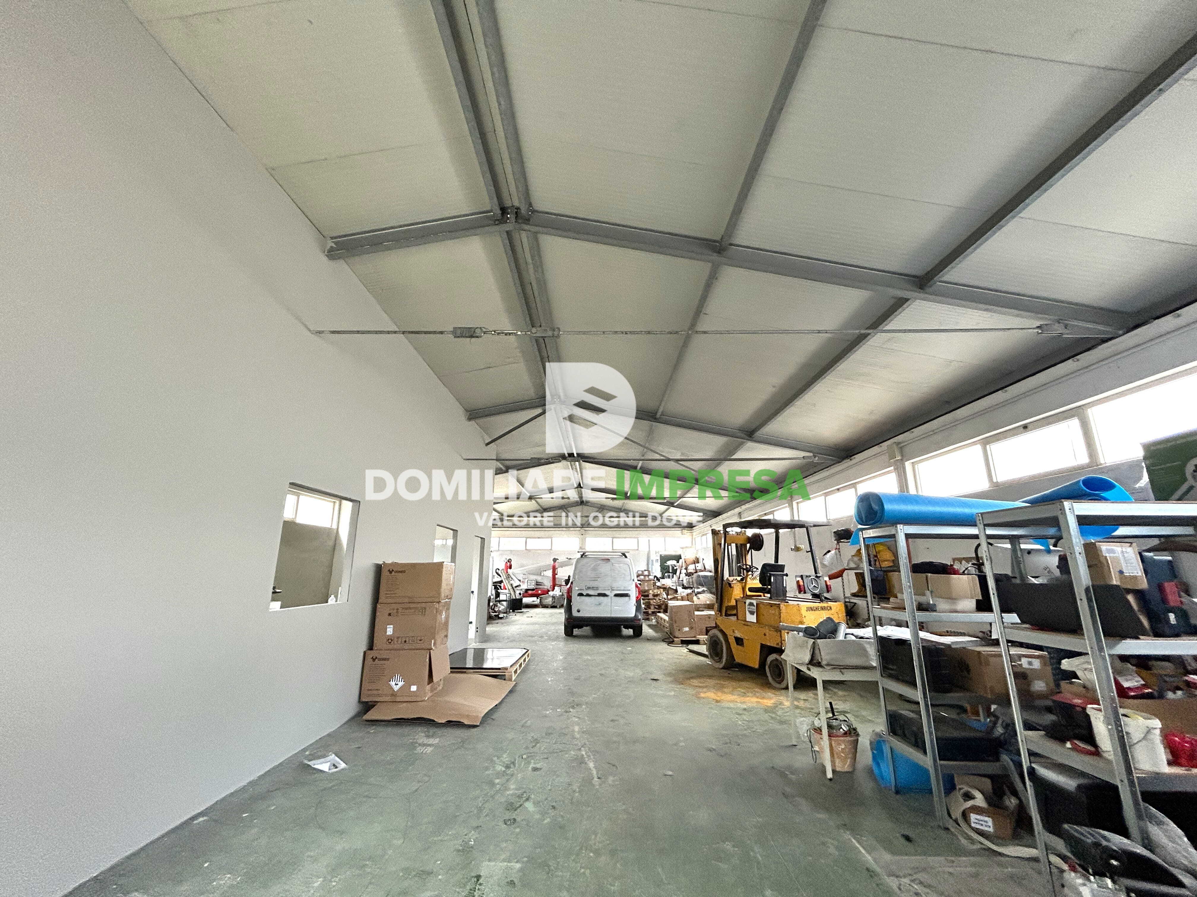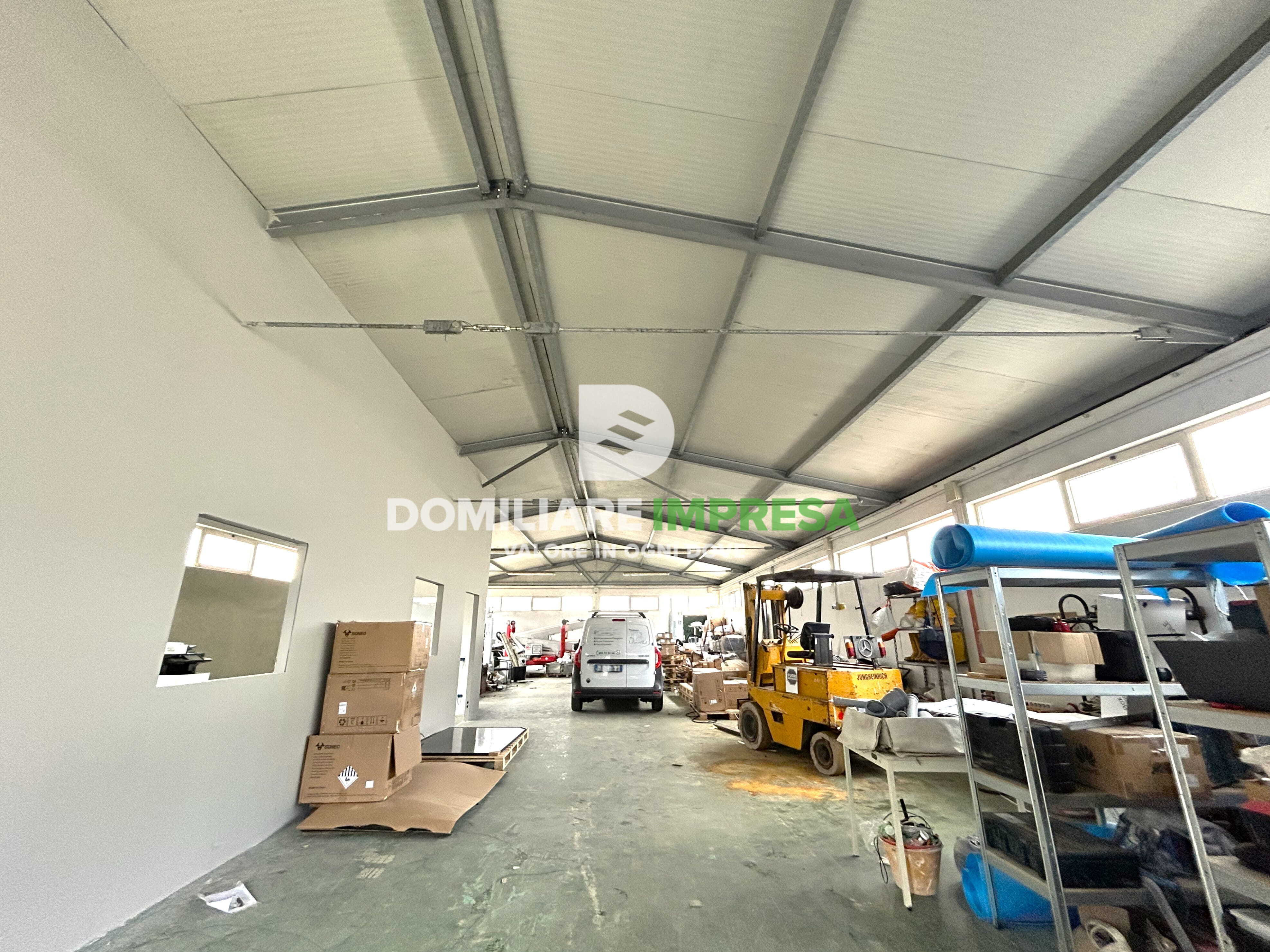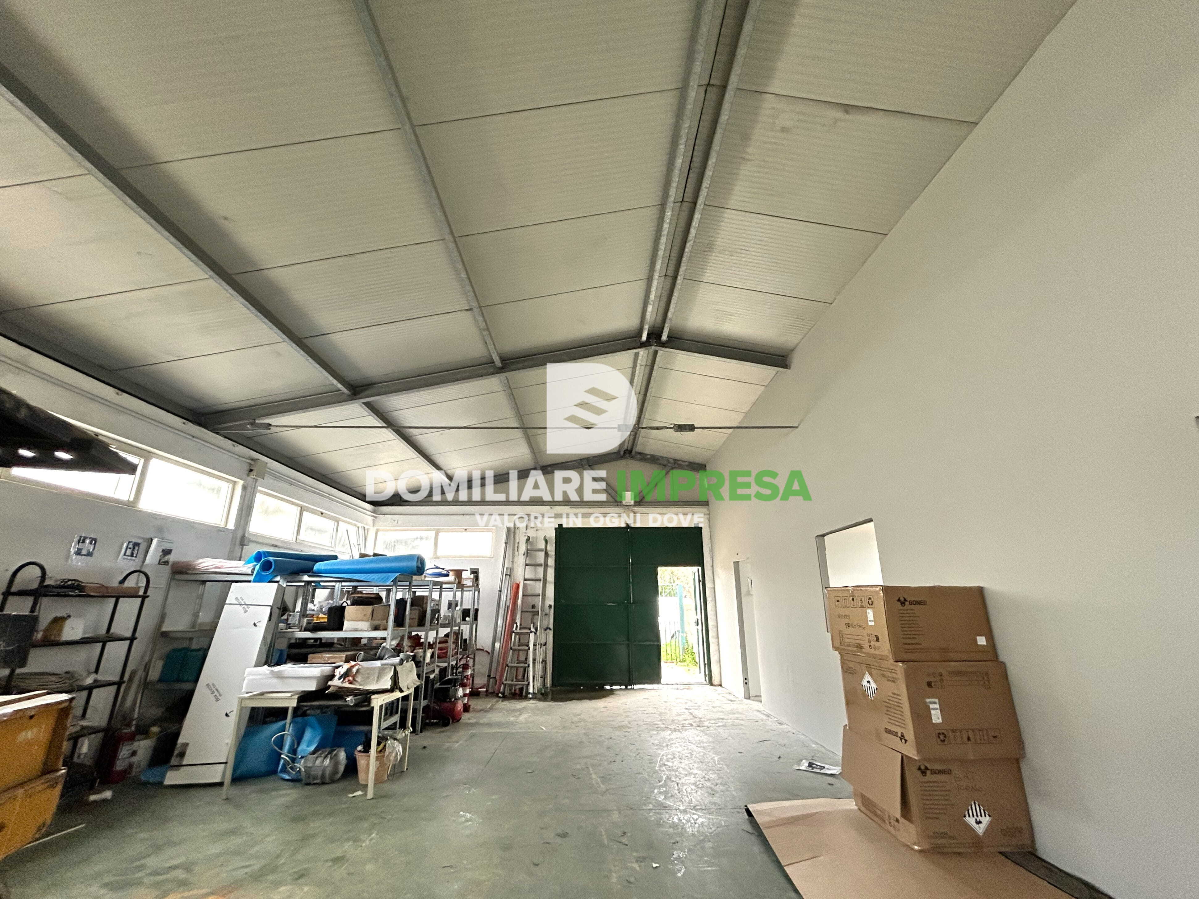 La struttura, in muratura con copertura in acciaio, offre altezze comprese tra 3,40 m e 4,40 m, caratteristiche che la rendono adatta sia a lavorazioni artigianali sia a stoccaggio e movimentazione merci.